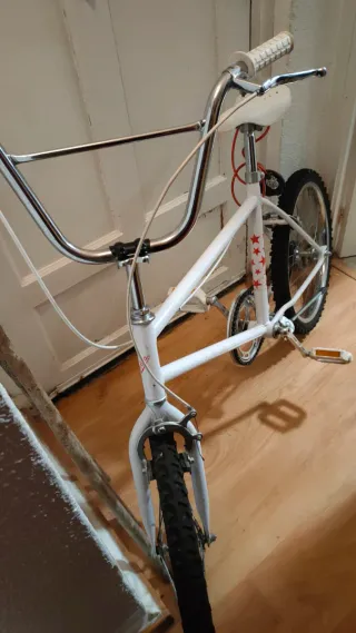 Bicicleta BMX clásica de estilo vintage, con un llamativo diseño en rojo y blanco. - Ruedas con neumáticos azules. - Manillar cromado. - Pedales blancos. También tiene el sillín,lo tengo guardado