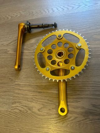 Plato, biela, eje de pedalier y rodamientos Thun en dorado anonizado 20", algo descolorido, usado con sus roces heridas de guerra y tiene un tornillo del plato diferente pertenecientes california star ... Longitud eje 136mm,por eso este precio Palabras clave/Vintage/Antigua/BMX/ California/X2/X3/X4/X5/Sky/Monty/Florida/ Weinman/Bicicross/Motoretta/Torrot/ Mongosse/Panther/Derbi/Rabasa/XL2/XL3/ XL4/star/Orbea/BH/G.A.C/Montesita/Mag/ trickstyle/kuwahara/Peugeot/Skyway/ Akimoto/crosseta/AKM4/Old/School/ Notario/Ambrosio/Hi-tech/Aeroyal/ Son piezas recuperadas de bicicletas clasicas o antiguas, pueden tener mas defectos que no se vean.