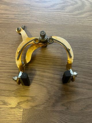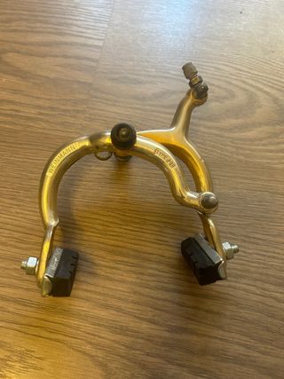 Puente de freno trasero o espárrago corto, marca Weinman, color dorado anonizado, perteneciente a California star, usado, OJO!!! muy descolorido, con sus roces y heridas de guerra pero perfectamente funcional. Zapatas de regalo. Palabras clave/Vintage/Antigua/BMX/ California/X2/X3/X4/X5/Sky/Monty/Florida/Weinman/Bicicross/Motoretta/Torrot/Mongosse/Panther/Derbi/Rabasa/XL2/XL3/XL4/star/Orbea/BH/G.A.C/Montesita/Mag/trickstyle/kuwahara/Peugeot/Skyway/Akimoto/crosseta/AKM4/Old/School/Notario/Ambrosio/Hi-tech/Aeroyal/ Son piezas recuperadas de bicicletas clasicas o antiguas, pueden tener mas defectos que no se vean.