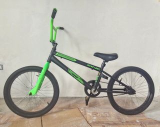 Bicicleta BMX de color negro con detalles en verde. - Cuadro robusto. - Manillar alto. - Ruedas de 20 pulgadas. (están desinfladas) - Pedales de plataforma. - Estriberas perfectas. -Casco de regalo.