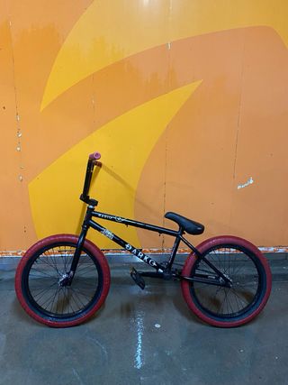 Bicicleta BMX de color negro con detalles en las ruedas y puños. - Cuadro de BMX. - Ruedas con radios rojos. - Puños de colores.