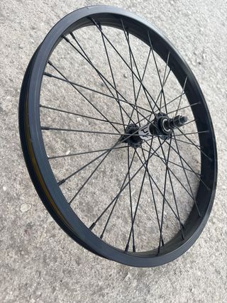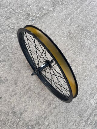 Rueda de BMX con un diseño llamativo y resistente. Lista para usar. - Aro de color dorado. - Radios negros.
