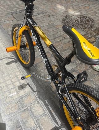 Bicicleta BMX de la marca WOLFBIKE con ruedas de 20 pulgadas. Diseño llamativo en color negro con detalles amarillos. Se incluyen 4 Pasadores de de Aleación de Aluminio en color dorado. La bicicleta está prácticamente nueva, apenas ha sido usada (en perfecto estado) - Cuadro robusto. - Manillar de BMX. - Pedales de plataforma.