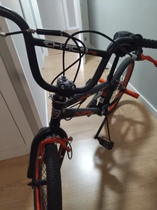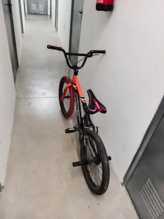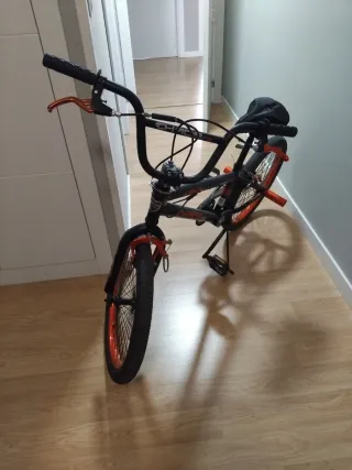 Bicicleta de estilo freestyle en buen estado, lista para la acción. - Cuadro de color negro con detalles naranjas. - Ruedas con llantas naranjas. - Manillar de estilo BMX.