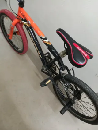 Bicicleta BMX de color rojo, ideal para trucos y paseos.edta tiene señales de abandono de no usar pero está en perfecto estado solo le faltaba la funda del sillín.es de las que se da la vuelta el manillar interesados contactar con José a recoger en Getafe o en el Casar de escalona Toledo - Manillar negro. - Rueda delantera con banda de rodadura marcada.