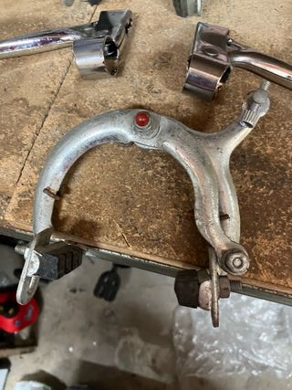 Conjunto de frenos para bicicleta BMX.Compuesto de herraduras y manetas,estas últimas están recién pulidas y las herraduras están muy usadas. - Mecanismo de freno en U. - Color plateado. - Incluye zapatas de freno.