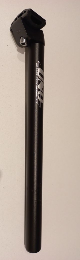 Tija Kalloy UNO para sillín de bicicleta. Características: * Longitud: 350mm. * Diámetros disponibles: 25.8/28.6/29.4 (Antes de hacer pedido especificar diámetro) * Retroceso: 20 mm. * Fijación: Un tornillo de titanio. * Uso: Carretera y ciclo cross * Compatible: Railes redondos * Color: Negro mate Liquidación de inventario, varias unidades disponibles nuevas a estrenar. Hago envíos a toda la península, Italia y Portugal