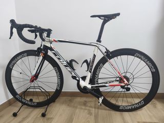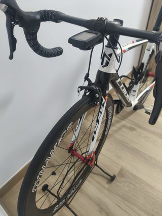 Bicicleta de carretera Colver Invicta con cuadro blanco y detalles en negro y rojo. Equipada con ruedas DYNAMICS de 5 pulgadas. - Cuadro, llantas, manillar y potencias de carbono. - Transmisión Shimano. - 9 velocidades. - Manillar de carretera. - Talla 54. - Se pueden incluir accesorios de regalo