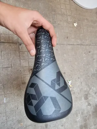 Sillín de bicicleta con un diseño moderno y llamativo. - Parte superior con diseño geométrico en gris y negro. - Parte inferior con patrón de cubos en relieve.