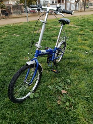 Bicicleta plegable en perfecto estado de color azul, ideal para desplazamientos urbanos o para llevarla contigo. - Cuadro de aluminio. - Ruedas de 20 pulgadas. - Portabultos trasero.
