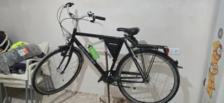 Bicicleta de paseo Panther en color negro. Ideal para desplazamientos urbanos y paseos. - Cuadro de aluminio. - Ruedas de 28 pulgadas. - Portabultos trasero. - Guardabarros. - Pata de cabra. - Botellín de agua verde incluido.