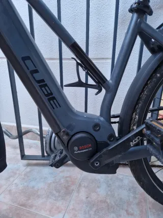Bicicleta eléctrica Cube en color negro. Diseñada para ofrecer una experiencia de pedaleo asistido. Cuadro de aluminio. - Ruedas de 28 pulgadas. Frenos de discoteca. - Portaequipajes trasero.