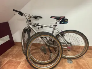 Bicicleta versátil, apta tanto para montaña como para carretera. Ideal para disfrutar de diferentes terrenos. - Cuadro de aluminio. - Ruedas de 26 pulgadas de montaña y de carretera ambas con el piñón en cada una - Cambio del pedal con las zapatillas talla 42 nuevas - Cambio Shimano. - Sillín deportivo. - Portabultos trasero.