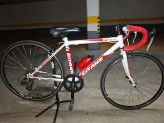 Bicicleta de carretera Gitane en color blanco con detalles rojos, ideal para niños o jóvenes ciclistas. - Cuadro de aluminio ligero. - Frenos de pinza. - Manillar de carretera con cinta roja. - Portabidón rojo incluido.