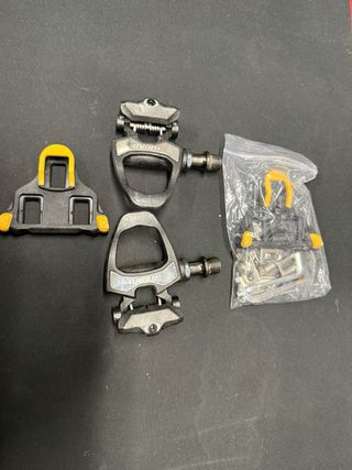 Set de pedales de bicicleta de carretera con calas. - Pedales autoblocantes. - Tensión ajustable. - Incluye calas y tornillería.
