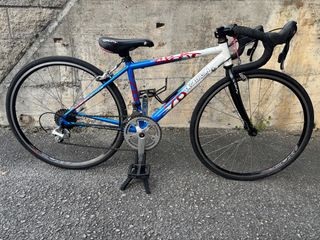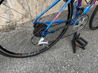 Bicicleta de carretera con un diseño moderno en azul y plateado. Buen estado. Talla M. Cuadro de aluminio.10 piñones , tres platos. - Cuadro de aluminio ligero. - Ruedas de 700c. - Manillar de carretera. - Cambio Shimano.
