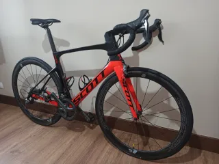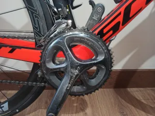 Bicicleta de carretera Scott con un diseño aerodinámico y llamativo en naranja y negro. - Cuadro de carbono,ruedas de carbono perfil 40 Speedsix,manillar aero 3T, Shimano Ultegra 52/36 y 11/32,cadena y ruedas con 6 meses,incluye pedales y porta bidones.La bicicleta va bien pero la maneta pequeña del cambio de platos hay que ayudarla a volver al sitio pero cambia perfectamente.Yo llevo así con ella mucho tiempo.Talla 54/M,para que os hagáis una idea yo mido 1'79m. Cualquier duda consultarme,un saludo !