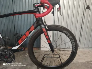 Vendo bici de carretera BH G7 con grupo electrónico ultegra Di2. Llantas de carbono evo 38 adelante y 50 atrás, manillar plano integrado visión, (doy otro original de bh de carbono pero no integrado). La bici está en muy buen estado, tiene una reparación de una picada en la horquilla (la compré así y no afecta a su uso ya que se reparo en tienda especializada pero era picada, no fisura) y alguna marca de uso en el cuadro, lo típico. La bici es muy ligera y va como un tiro, pero la doble paternidad hace que la venda porque me jode tenerla parada...no regateo, si te gusta te la llevas. Solo los componentes valen eso. Talla SM.