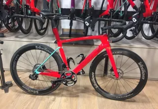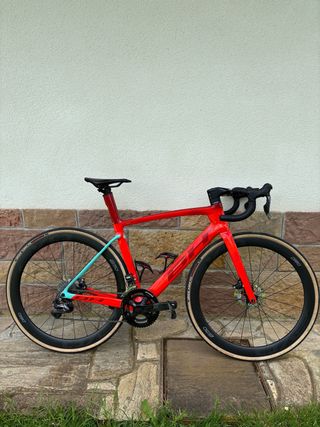 Bicicleta de carretera BH G8, talla M, en color naranja y rojo, con detalles en azul turquesa. Diseñada para competición. - Cuadro de carbono. - Ruedas Vision Metron 50mm tubular - Grupo electrónico FSA Kforce con frenos de disco. - Bielas de carbono FSA slk. - Platos 52- 39 - Manillar con cinta roja y negra.