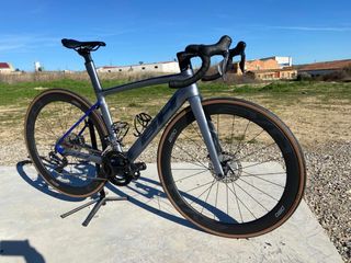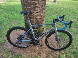 Bicicleta de carretera BH G8 con un diseño aerodinámico y moderno, muy poco uso. •Cuadro full carbono •Talla MD •Ruedas carbono con buje DT 240 tubular •Conjunto Sram Force electrónico •Freno de disco •Velocidades 12v 48-35T •Pedales shimano •Color Gris y Azul Revisada y puesta a punto por tienda profesional Ciclos Faustin. Más bicicletas y tallas en el perfil. Como nueva. Se hacen envíos. Para cualquier duda o más fotos, puedes contactar por Wallapop o al 628049030. Abstenerse a ofertas absurdas. Solo venta, no acepto cambios.