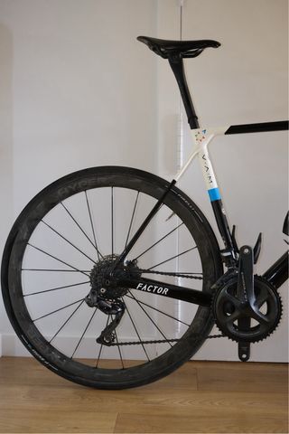 Factor SLICK TT. Montada con Shimano Ultegra Di2 11v Disc. Platos FSA 54-42 y bielas FSA METRON CARBON de 170. Cassette Dura Ace 11-30. Cockpit 51 SPEEDSHOP. Llantas Black Inc. Delantera Tubular SIXTY (perfil 60) Trasera Tubeless "62". Sillín Sellé Italia WATT Carbon. Talla S. Sillín a 73 en las fotos. Bicicleta con uso.