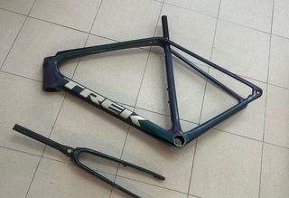 Conjunto de cuadro y horquilla de carbono para bicicleta de carretera, modelo Project One de Trek del año 2024. El color es un degradado iridiscente entre morado y verde azulado. - Cuadro de carbono - Horquilla de carbono - Incluye mast-cap I've got a 2024 Project One, Trek Edmond frame/fork and mast-cap to get rid of, 58cm, SLR 800. It has a crack on the seat-stay, non-drive side. Super cheap offer at €250 if you are keen to have it patched up.