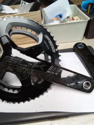 Se vende bicicleta de carretera Cervélo de carbono, talla M. Está en buenas condiciones, aunque presenta algunas marcas de uso en el cuadro y el pedalier. - Cuadro de carbono Cervélo. - Talla M. - Incluye ruedas y componentes como se ve en las fotos.