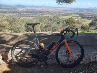 Bici de carbono muy ligera. Marca KTM revelator. Plato grande de 50 dientes y el pequeño de 34. Tengo pedales de cala, llanta delantera SPLINE y trasera PR-2, frenos ULTEGRA SHIMANO. Talla M. 550€, solo Rentería y alrededores. No hago envios, solo en mano.
