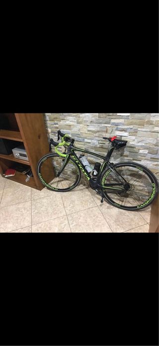 Bicicleta de carretera con un diseño llamativo en negro y verde. Ideal para tus rutas. - Cuadro de carbono. - Ruedas Campagnolo. - Manillar y sillín en verde. - Grupo shimano. - Rotor Qrings (Platos ovalados con bielas Rotor). - Pedales shimano. - Peso 7.3 kg - Contador cateye - Ruedas continental nuevas 5000 grand prix Tr. - Rodamientos cerámicos y nuevos. - Siempre al mínimo detalle y con poco uso. - Talla XS.