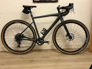 Bicicleta de gravel Megamo Jakar 3.0 en color gris oscuro. - Cuadro de aluminio. - Frenos de disco. - Ruedas de 700c con neumáticos mixtos. - Transmisión SRAM Apex. También acepto cambio por bici MTB doble suspensión equivalente.