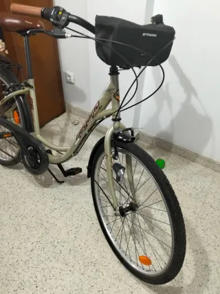 Bicicleta Megamo Roda en color beige, ideal para paseos. - Cuadro de aluminio. - Ruedas de 26 pulgadas. - Sillín marrón. - Cesta delantera. - Portabultos trasero.y bolso delantero