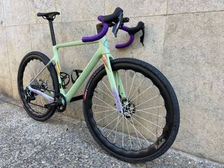 Bicicleta Megamo Silk con personalización única. - Cuadro de color verde menta con detalles gráficos. - Manillar y puños en color morado. - Ruedas de carbono Radiats 45W Series, montadas con radios BERD de hilo. -Manetas Sram Red 13V -Talla M -Bielas rotor 2 in power. -Hammerhead.