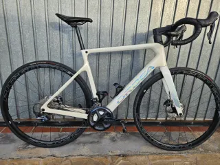 Bicicleta de carretera Orbea Avant en talla 53 de fibra carbono (8kg). Modificada con: - Cambio trasero Shimano Ultegra - Cambio delantero Shimano 105 - Frenos de disco mecánico - Ruedas Vittoria Zaffiro Pro (700x25c) - Sillín Specialized Power - 2 porta bidones - Cuenta kilómetros - Pedales (Look) Tiene una pequeña rallada en un lateral.