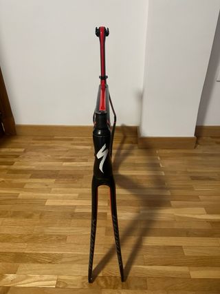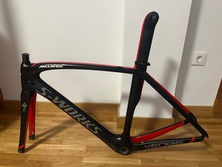Cuadro de bicicleta de carretera Specialized Venge con detalles McLaren. Con una pequeña fisura facilmente reparable. Con todas las tapas de cableado - Material: Carbono. - Color: Negro y rojo. - Diseño aerodinámico.
