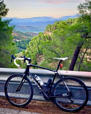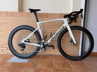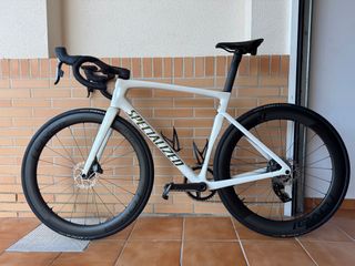 Bicicleta de carretera. - Cuadro y horquilla de carbono talla 54. - Ruedas carbono 60mm trasera/50mm delantera. - Manillar integrado. - Frenos de disco. - Sram Rival completo (46/33,11/30,172’5) con potenciometro Quarq. - Sillín Specialized. - cinta manillar Supacaz. - portabidones Specialized. - cubiertas Continental 28mm.