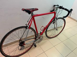 Cuadro de gama alta en acero Columbus EL (Extra Leggeri) Nivacrom, muy valorado por coleccionistas por su bajo peso y confort. Horquilla y vainas cromadas. • Transmisión: Grupo Shimano RX100 (2x8v) con manetas integradas (STI). • Ruedas: Llantas de aluminio perfil medio en rojo a juego. Cubiertas Michelin. • Sillín: Selle Italia Genuine Gel. • Estado: Lista para rodar. Marcas de uso estéticas que no afectan al rendimiento. Ideal para marchas tipo Eroica o uso urbano con estilo. Talla L