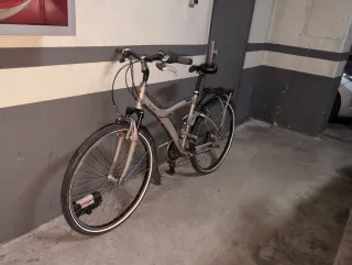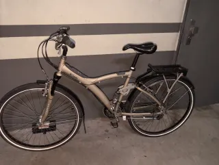 Bicicleta B'Twin Seven 7 en talla L. Ideal para paseos y desplazamientos urbanos. - Cuadro de aluminio. - Suspensión delantera. - Suspensión trasera. - Fijaciones para pedales. - Portabultos trasero. - Guardabarros.
