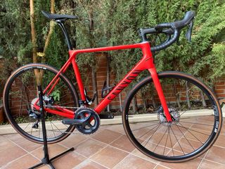 Talla L. Comprada hace 7 meses, dispongo de factura. La vendo por lesión. La entregaría con pedales Ultegra (valorados en 100€), Luz trasera (40€), Garmin 520 edge plus y su soporte de manillar y cargador, y porta bidones. La bici está en perfecto estado mecánico y fue revisada (con factura) integralmente y se le cambió la cadena hace 2 meses, tiene alguna marca muy pequeña de uso habitual en estas bicis. -Cuadro Carbono CF3 -Grupo completo ULTEGRA Di2 Electrónico -Frenos ULTEGRA -Ruedas Reynolds CARBONO -Tija Carbono -Potencia cambiada a 90mm (entrego la original de 120mm) **Dudas escribir un mensaje sin compromiso. NO ENVÍO