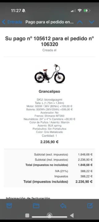 Bicicleta eléctrica Grancalipso en color Gris Metalizado. - Talla L (1,75m - 1,84m) - Motor: 500W/36V (80Nm) - Batería: 930Wh (36V/25Ah) - Frenos: Shimano MT200 - Neumáticos: 24 x 4 Carretera - Asiento: Marrón BLK spring - Portabultos: Sin Portabultos Acepto cambio
