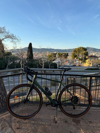 Bicicleta de gravel Triban de Decathlon, talla M - Color verde oscuro. - Ruedas con llantas marrones. - Incluye portabidón negro.