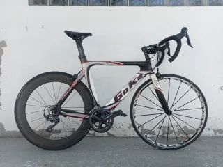 Bicicleta Goka carretera aero. Talla 54 m/l mido 1.82 y me va bien, para más altura iría justa. Conjunto carbono Goka: Cuadro + Horquilla + tija + manillar. Cubiertas Continental Gp5000 y Gp4000 Cámaras TPU nuevas Tubolito Llanta delantera Mavic aluminio, 550 gramos Llanta trasera Reynolds carbono perfil 60, 680 gramos (falta 1 radio pero la equilibré así y funciona perfectamente). Sillín carbono 115 gramos Grupo Shimano Ultegra 11v mecánico Pedales Mavic 200 gramos la pareja Frenos Colnago Eje de pedalier Ultegra 7.5 kgs