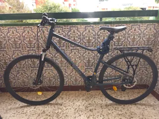 Bicicleta Riverside 500 de color azul marino. - Cuadro de aluminio. - Frenos de disco. - Transmisión de 9 velocidades. - Suspensión delantera. - Ruedas de 28 pulgadas. - Talla L de 1,78 m a 1,89 m. - Viene con Portaequipajes bicicleta B'twin 500 26-28 pulgadas instalado, valorado en 34,99€. (Incluido) - Regalo casco, candado y luces delantera y trasera.