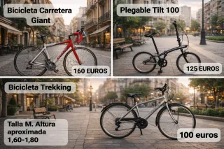 Se venden bicicletas en buen estado, listas para usar. Si necesitas información preguntame. - Bicicleta de carretera Giant, talla M, para alturas de 1,60-1,75m. Precio: 160 euros. - Bicicleta Trekking, talla M, para alturas de 1,60-1,80m. Precio: 100 euros. - Bicicleta plegable Tilt 100. Precio: 125 euros. Ubicación: Málaga Capital, Barriada Nueva Málaga. Todas están revisadas y listas para usar, que otros no te engañen.