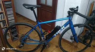 Bicicleta de carretera marca Trek eléctrica talla M. en color azul. Motor de 250 vatios..autonomia para 80kms.,En la foto del display se ve los kms totales que tiene 680 kms está nueva. - Cuadro de aluminio. - Frenos de disco. - Ruedas de 700c. - Transmisión Shimano.