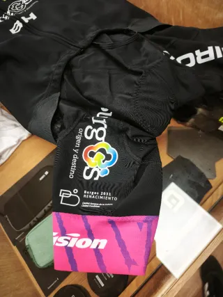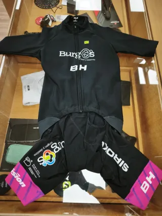 Conjunto de ciclismo BH, con diseño de Burgos BH. - Maillot negro con cremallera completa. - Culotte negro con tirantes. - Logos de BH y origen y destino en maillot y culotte. - Detalles en rosa y morado en las perneras del culotte. - Culotte afelpado - Mallot ( tipo Gabba ) interior afelpado A ESTRENAR. Ambos talla S