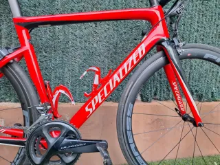 Bicicleta de carretera Specialized Tarmac de color rojo. - Cuadro de carbono. - Ruedas de perfil. - Componentes Shimano Ultegra.