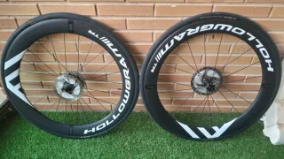 Juego de ruedas de carbono para bicicleta de carretera. - Marca: Hollowgram. - Modelo: 64 Knot. - Frenado: Disco. - Material: Carbono. - Perfil: 65 - Pvp: 2.190 €. - Peso par: 1.540 gramos. - Bujes: Hg Ceramic.