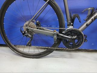 - Cuadro: Aluminio, eje pasante 12×142 mm, compatible con neumáticos hasta 700×45C. - Horquilla: Aluminio gravel, eje pasante 12×100 mm, compatible con neumáticos hasta 700×45C. - Transmisión: Manetas Shimano RX610 12v + frenos Shimano RX400 + cadena Shimano M6100 12v. - Llantas: Gravel 32H con buje Shimano RS400. - Neumáticos: Hutchinson Touareg 700×45C.