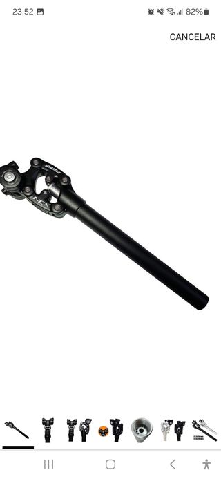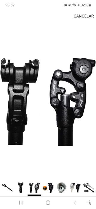 Viaje: 50 mm. - Sistema: sistema de paralelogramo de buje de latón- Retroceso de 25 mm. - Diámetro exterior: 27,2 mm. - Longitud: 350 mm. - Sistema de suspensión: bobina interna con ajuste de precarga. Material del brazo: aleación. Categoría objetivo: todo tipo de deportes de carretera/MTB. Para rieles de sillín de 7 mm. Peso: 792 g. Color: negro (como se muestra en la imagen.
