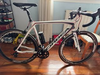 Bicicleta de carretera Orbea en color blanco con detalles en rojo y negro. Ideal para disfrutar del ciclismo. - Cuadro de carbono. - Ruedas Campagnolo Bullet de 50mm. - Manillar de carretera Bontrager. - Cambio mecánico 105 muy fiable - Talla 55 -Cubiertas Continental gp5000 bronce 700x28 (quizás para cambiarlas)